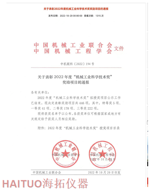海拓儀器榮獲2022年度中國機械工業(yè)科學技術(shù)獎?ICC訊?10月20日,2022年度“中國機械工業(yè)科學技術(shù)獎”項目名錄正式發(fā)布,由海拓儀器(江蘇)有限公司完成的“超快速冷熱沖擊試驗系統(tǒng)關(guān)鍵技術(shù)研究與系列應用”項目榮獲2022年度“中國機械工業(yè)科學技術(shù)獎”三等獎。??據(jù)了解,中國機械工業(yè)科學技術(shù)獎是根據(jù)《國家科學技術(shù)獎勵條例》和《社會力量設(shè)立科學技術(shù)獎管理辦法》的有關(guān)規(guī)定,由中國機械工業(yè)聯(lián)合會和中國機械工程學會共同設(shè)立并經(jīng)國家科學技術(shù)部批準,在國家科技獎勵主管部門登記的面向全國機械行業(yè)的綜合性科技獎項。旨在表彰在機械工業(yè)科技工作中作出突出貢獻的單位和人員,獎勵范圍包括:機械工業(yè)科學技術(shù)發(fā)明成果、機械工業(yè)科學技術(shù)進步成果、機械工業(yè)工程化和新技術(shù)推廣成果和機械工業(yè)軟科學和標準成果。??海拓儀器是一家集研發(fā)、制造、貿(mào)易于一體高科技現(xiàn)代化公司,公司成立于2005年,主要產(chǎn)品包括:超快速冷熱沖擊試驗機(熱流儀)、快速溫變應力篩選試驗箱(ESS), -